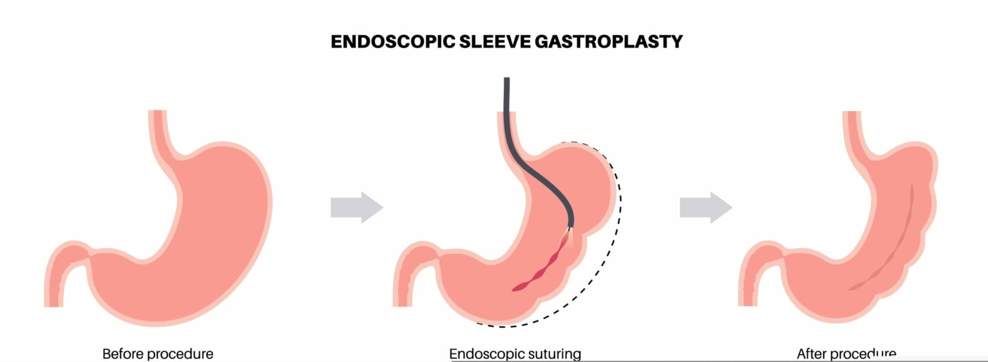 Endoscopic Sleeve Gastroplasty (ESG) เป็นวิธีการรักษาโรคอ้วนที่ใช้เทคนิคการส่องกล้อง เพื่อเย็บกระเพาะอาหารให้มีขนาดเล็กลง ซึ่งช่วยให้ผู้ป่วยรู้สึกอิ่มเร็วขึ้นและบริโภคอาหารได้น้อยลง โดยไม่ต้องทำการผ่าตัดเปิดหน้าท้อง