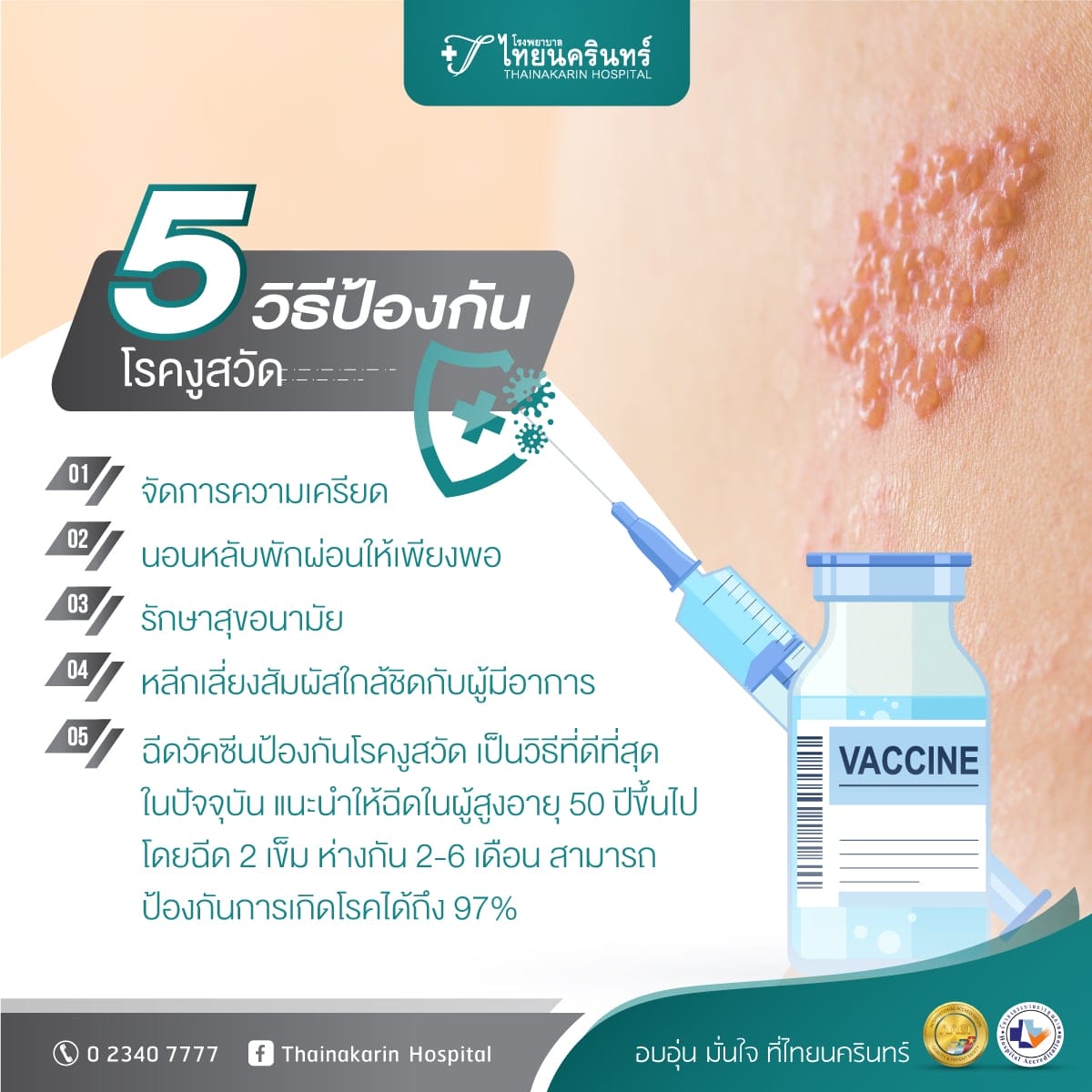 ฉีดวัคซีนป้องกันโรคงูสวัด เป็นวิธีที่ดีที่สุดในปัจจุบัน แนะนำให้ฉีดในผู้สูงอายุ 50 ปีขึ้นไป โดยฉีด 2 เข็ม ห่างกัน 2-6 เดือน สามารถป้องกันการเกิดโรคได้ถึง 97%