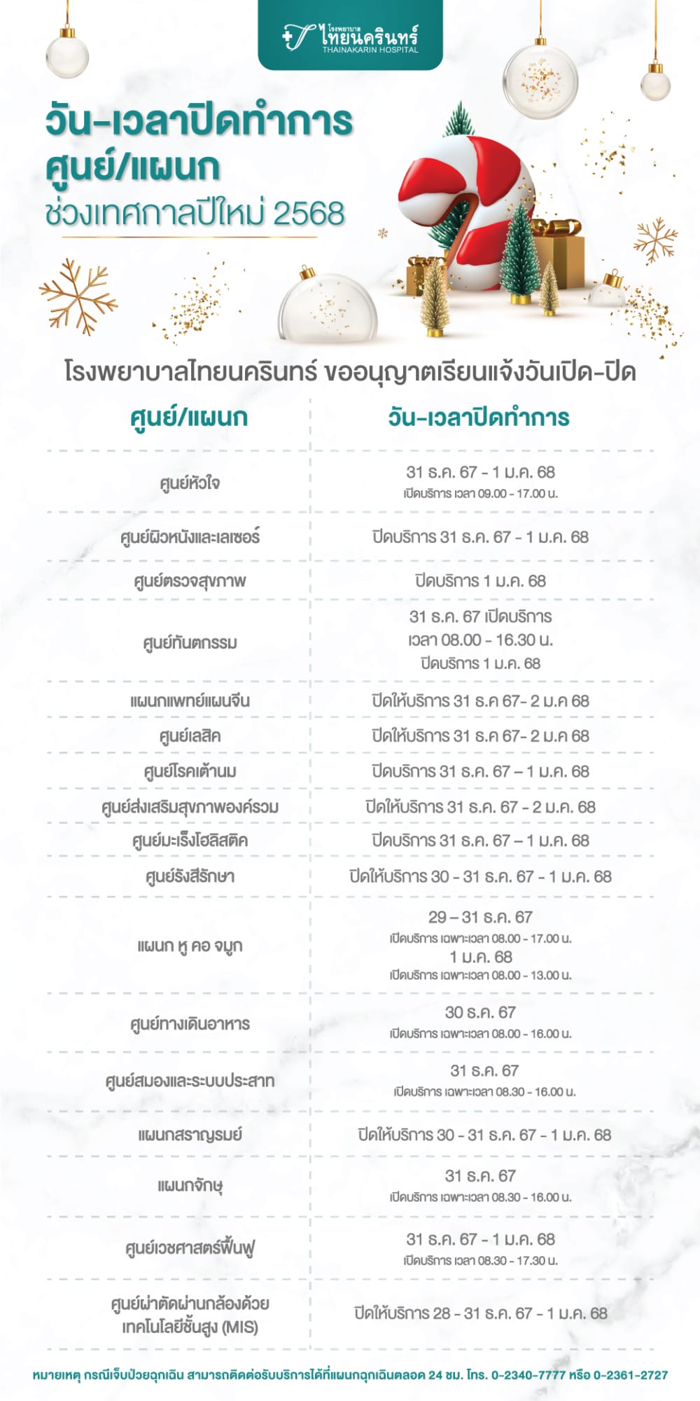 โรงพยาบาลไทยนครินทร์ ขออนุญาตเรียนแจ้งวัน ‘เปิด-ปิด’ บริการของศูนย์/แผนกต่างๆ ในช่วงเทศกาลปีใหม่ 2568
