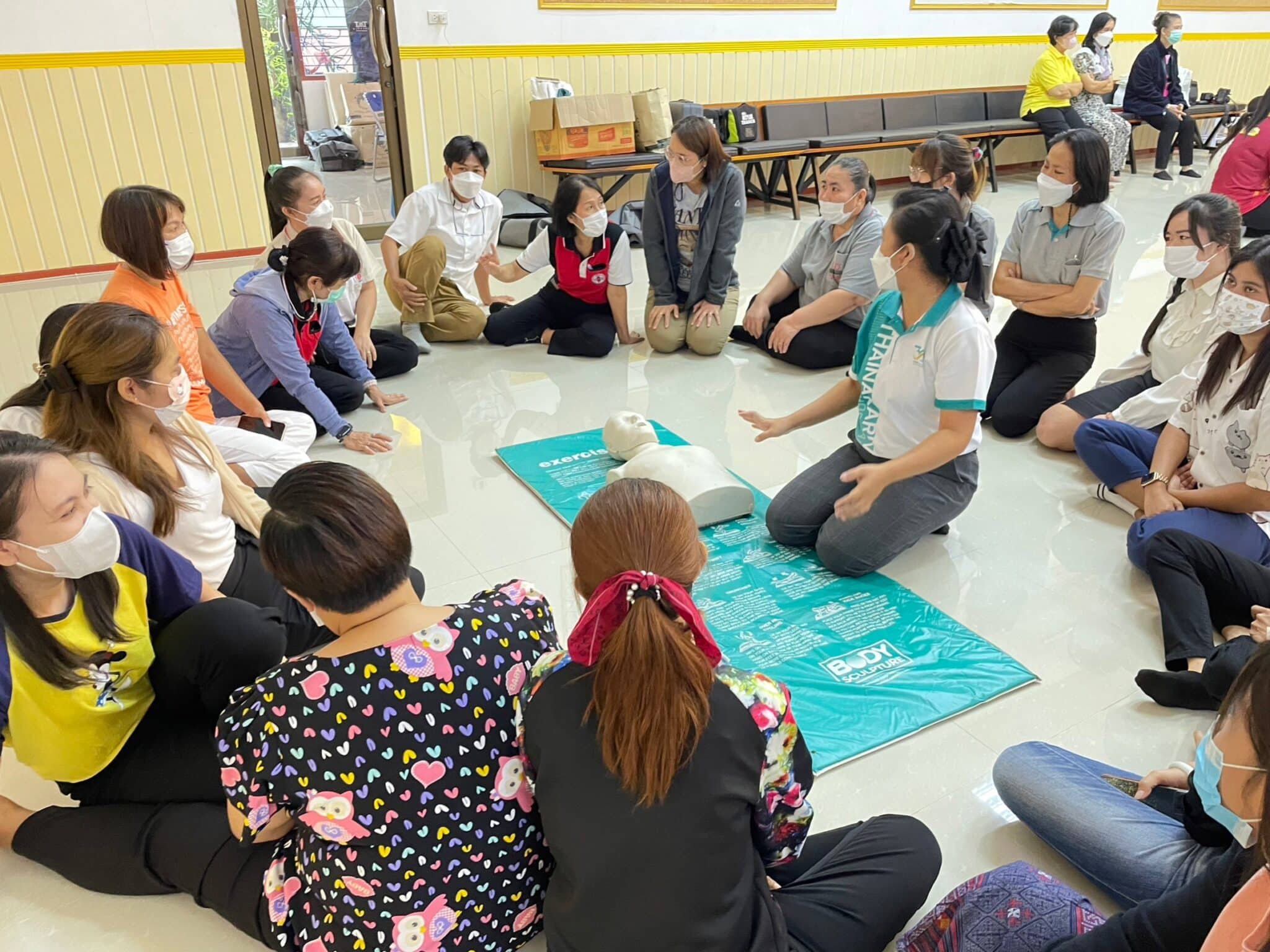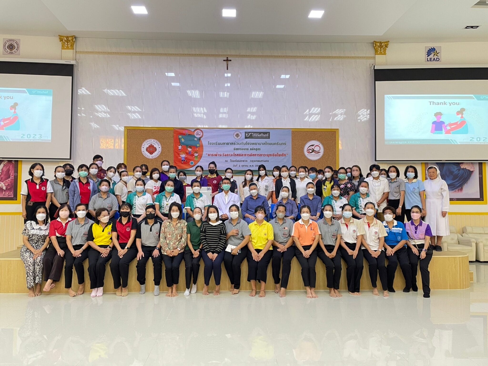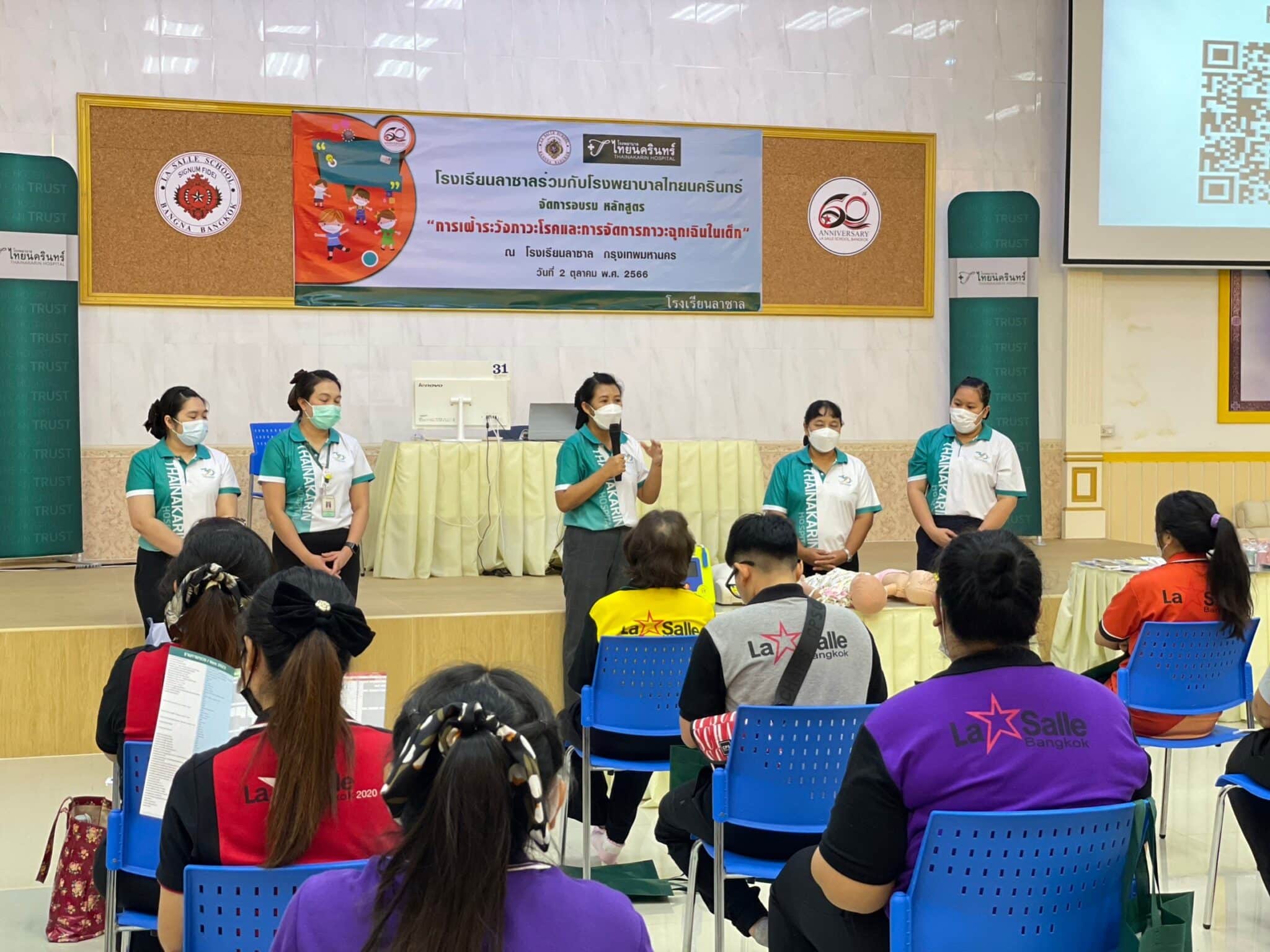 โรงพยาบาลไทยนครินทร์ร่วมกับโรงเรียนลาซาล กรุงเทพฯ จัดอบรมหลักสูตร “การเฝ้าระวังภาวะโรคและจัดการภาวะฉุกเฉินในเด็ก” เพื่อส่งเสริมความรู้และฝึกทักษะให้กับคุณครูระดับชั้นอนุบาล ภายในงานมีการบรรยายในหัวข้อ “โรคยอดฮิตในเด็กที่มากับฝน” วิทยากรโดยนพ.กำพล วีรกาญจนา แพทย์หัวหน้าแผนกกุมารเวชกรรม รวมถึงสอนการปฐมพยาบาลเบื้องต้น และการจัดการภาวะฉุกเฉินในเด็กอายุ 2-5 ปี โดยพยาบาลวิชาชีพ เช่น การสำลักอาหารในเด็ก ภาวะหัวใจหยุดเต้นเฉียบพลัน มีการสอนทำ CPR และสอนการฝึกใช้เครื่องช็อคหัวใจอัตโนมัติ AED เมื่อวันจันทร์ที่ 2 ตุลาคม 2566 ณ โรงเรียนลาซาล กรุงเทพฯ