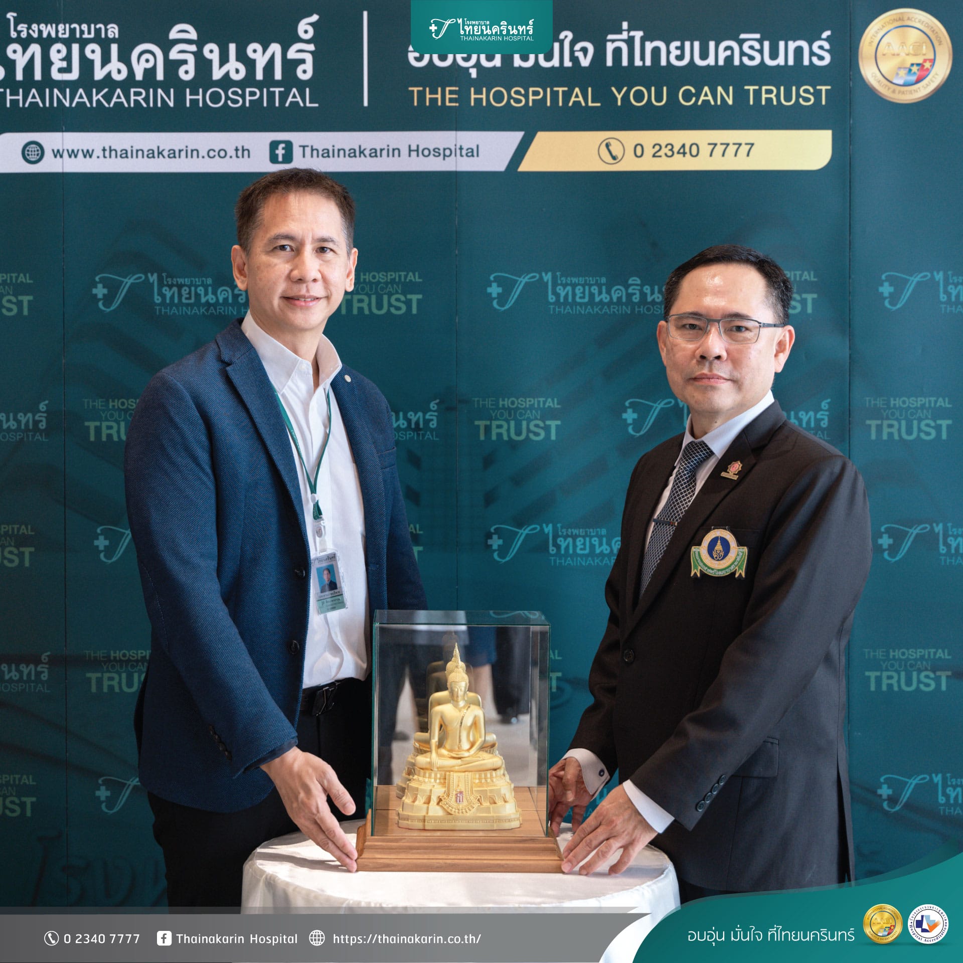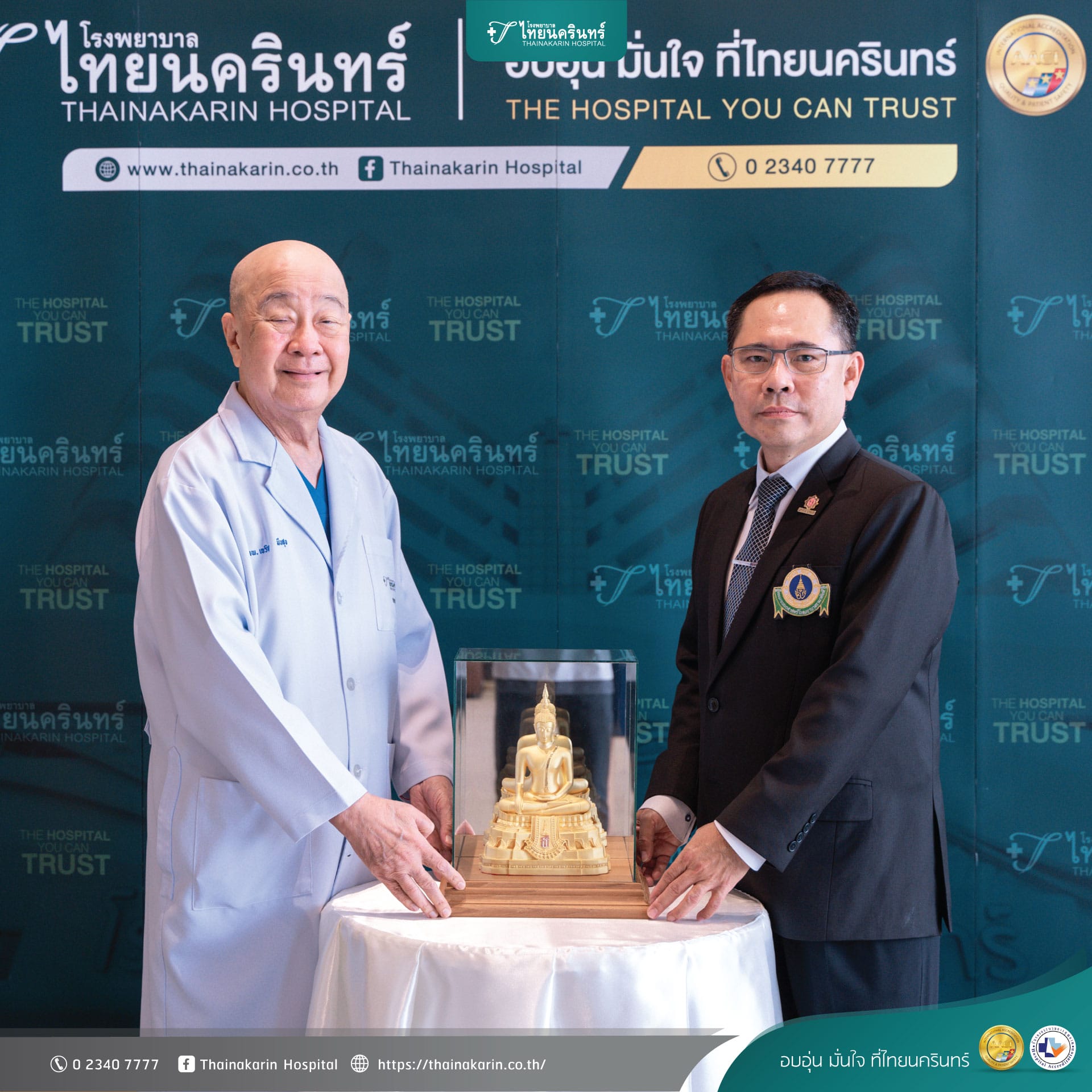 นายแพทย์เจริญ มีนสุข ประธานกรรมการ บริษัท โรงพยาบาลไทยนครินทร์ จำกัด (มหาชน ) คุณฐิติ สิหนาทกถากุล ประธานบริหาร พร้อมด้วยคณะผู้บริหาร แพทย์ ร่วมรับมอบพระพุทธรูปทองคำ พระพุทธมหาสุวรรณปฏิมากร วัดไตรมิตรวิทยารามวรวิหาร ขนาดหน้าตัก 5 นิ้ว องค์เรซิ่น หุ้มทองคำ 99.99% จำนวน 2 องค์ จากมูลนิธิรามาธิบดีฯ
