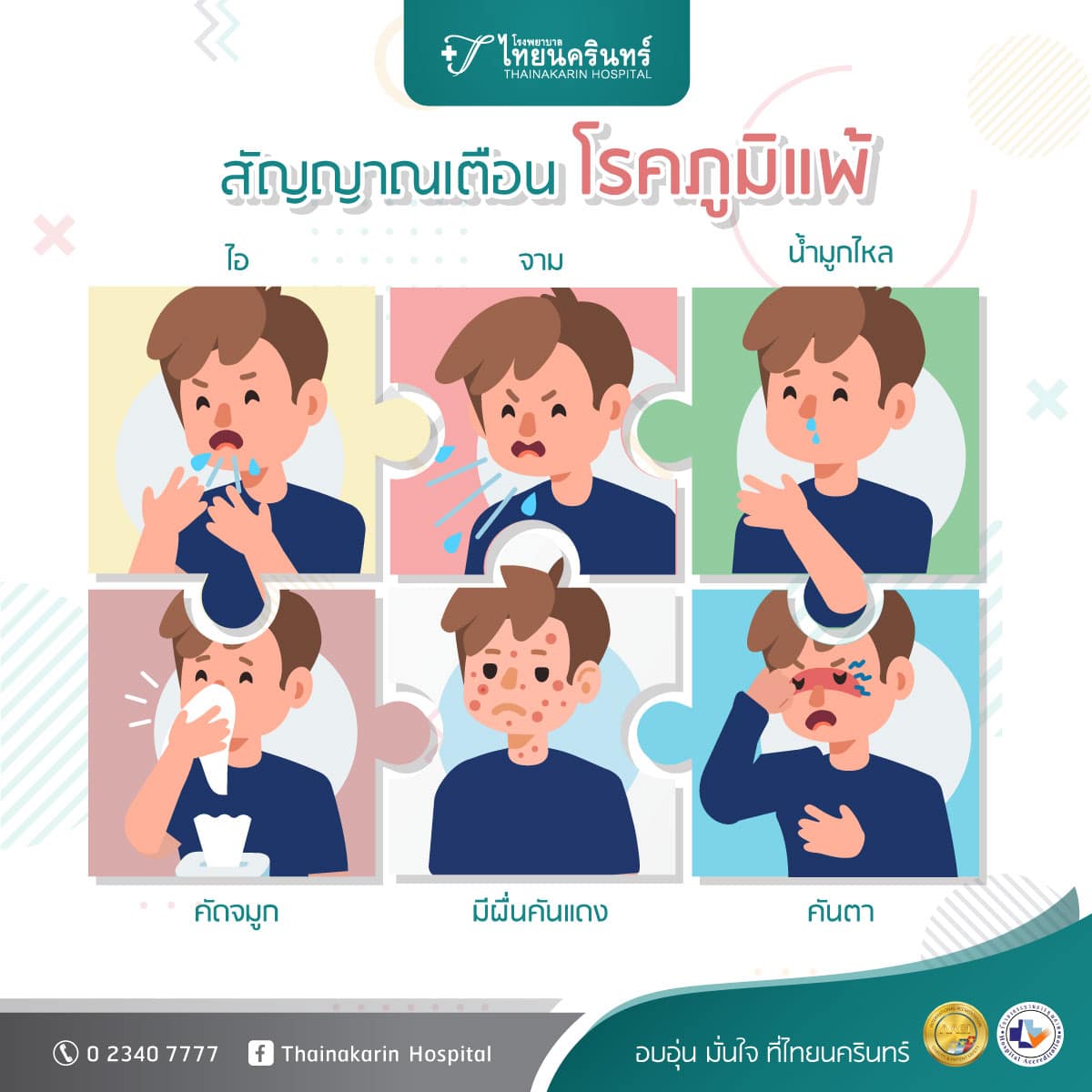 ภูมิแพ้ (Allergy) โรคยอดฮิตที่ใครๆ ก็เป็นได้ โดยเฉพาะผู้ที่มีภาวะไวผิดปกติ ส่งผลให้เกิดอาการไอ จาม น้ำมูกไหล คัดจมูก มีผื่นคันแดง คันตา ฯลฯ แต่สามารถป้องกันได้ง่าย ๆ ด้วยการตรวจหาสาเหตุของภูมิแพ้ให้ชัดเจน เพื่อนำไปสู่การป้องกันตนเองอย่างตรงจุด