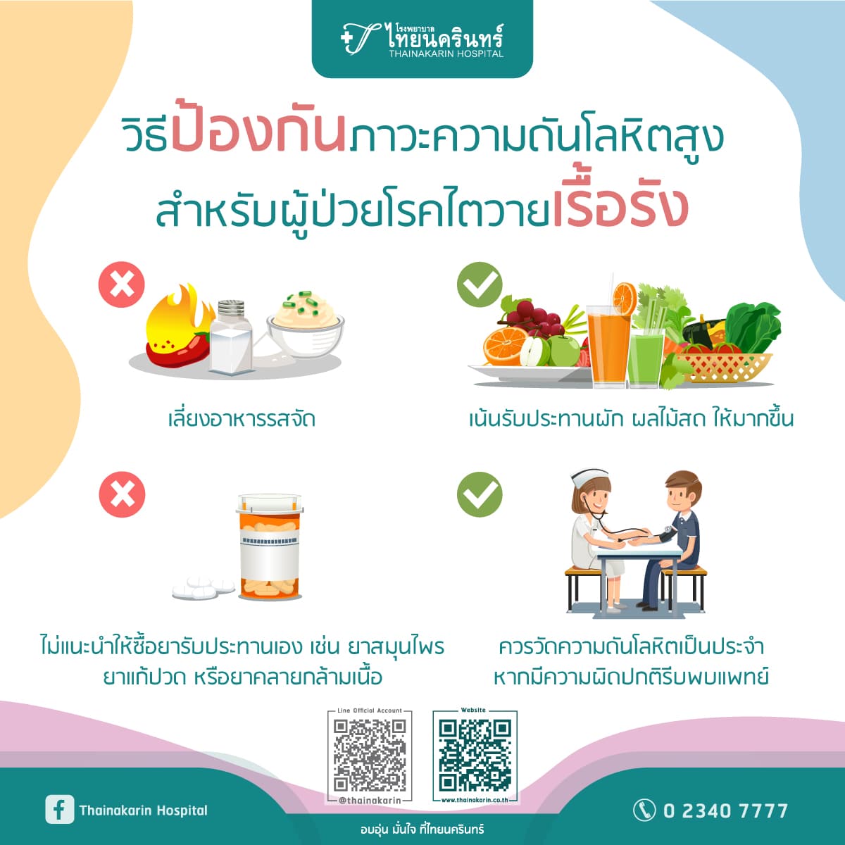 ส่วนใครที่มีคำถามเพิ่มเติมเกี่ยวกับโรคความดันโลหิตหรือโรคไตวายเรื้อรัง ก็สามารถติดต่อมาที่ โรงพยาบาลไทยนครินทร์ เรามีแพทย์ผู้เชี่ยวชาญพร้อมให้คำปรึกษาและทำการรักษาอย่างเหมาะสมตามอาการของผู้ป่วย