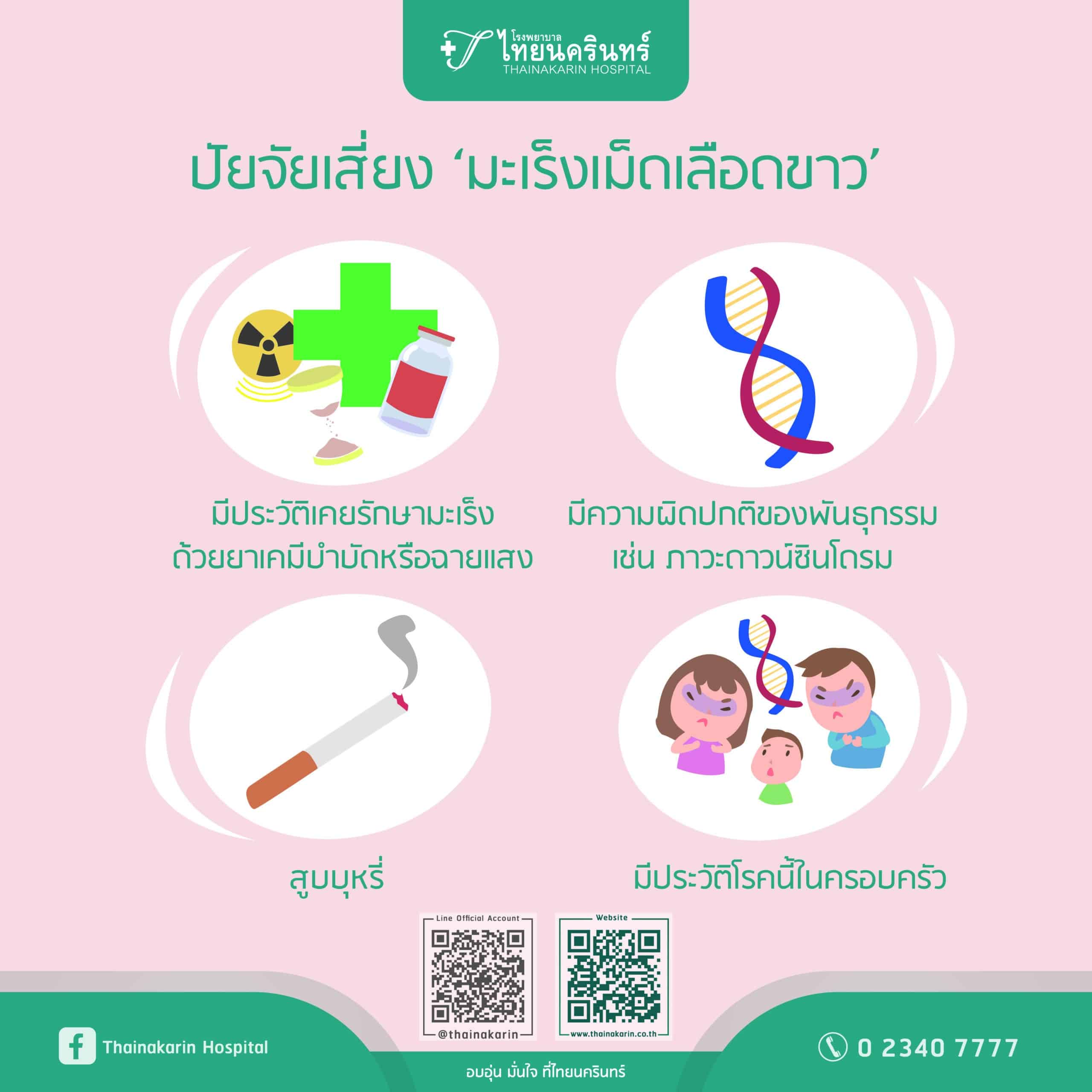ผู้ป่วยมะเร็งเม็ดเลือดขาวมักมีอาการติดเชื้อได้ง่ายจากเม็ดเลือดขาวที่ต่ำ จึงควรเลือกรับประทานอาหารที่สุก สะอาด เเละถ้ามีอาการผิดปกติ เช่น มีไข้ อ่อนเพลีย หรือเลือดออกผิดปกติ ควรรีบมาปรึกษาเเพทย์ทันที