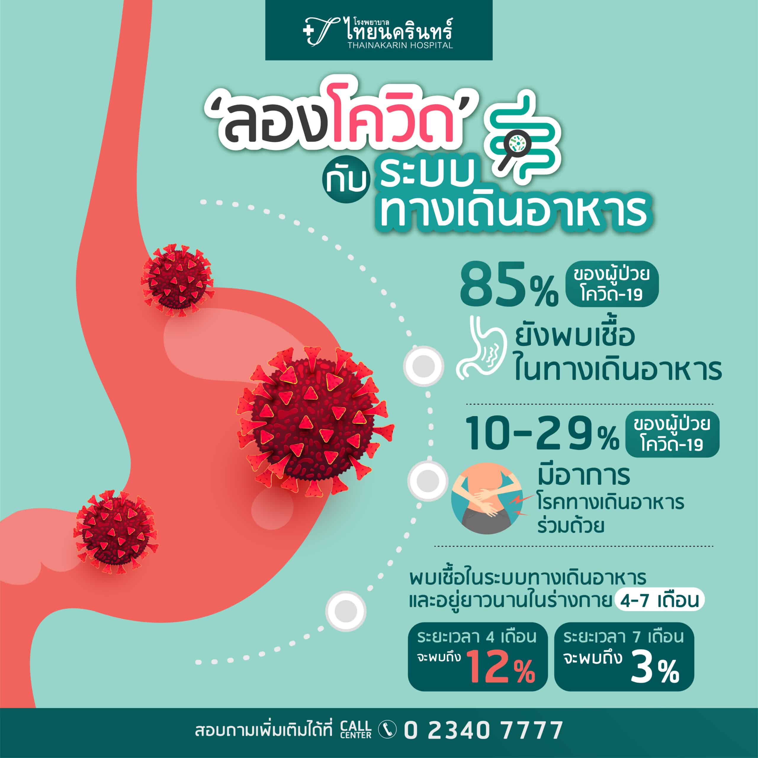 จากการรายงานพบว่า 10-29% ของผู้ป่วยโควิด-19 จะมีอาการโรคทางเดินอาหารร่วมด้วย ถึงแม้ว่าโควิด-19 จะเข้าสู่ร่างกายด้วยระบบทางเดินหายใจ หรือ เยื้อบุต่างๆ ก็ตาม แต่พบว่า 85% ของผู้ป่วยโควิด-19 สามารถตรวจพบเชื้อในระบบทางเดินอาหารได้ และอยู่ยาวนานในร่างกาย 4-7 เดือน โดยในระยะเวลา 4 เดือน จะพบถึง 12% และพบ 3% ที่ 7 เดือน การที่ตรวจพบเชื้อโควิด-19 ในระบบทางเดินอาหารสามารถทำให้เกิดอาการ เช่น เบื่ออาหาร คลื่นไส้ อาเจียน ปวดท้อง ท้องเสีย 10% และกรดไหลย้อน 20% ปัจจุบันมีข้อมูลรายงานชัดเจนว่าการที่เรายังมีเชื้ออยู่ในระบบทางเดินอาหารจะสัมผัสกับอาการของภาวะลองโควิดที่เกิดขึ้นด้วย