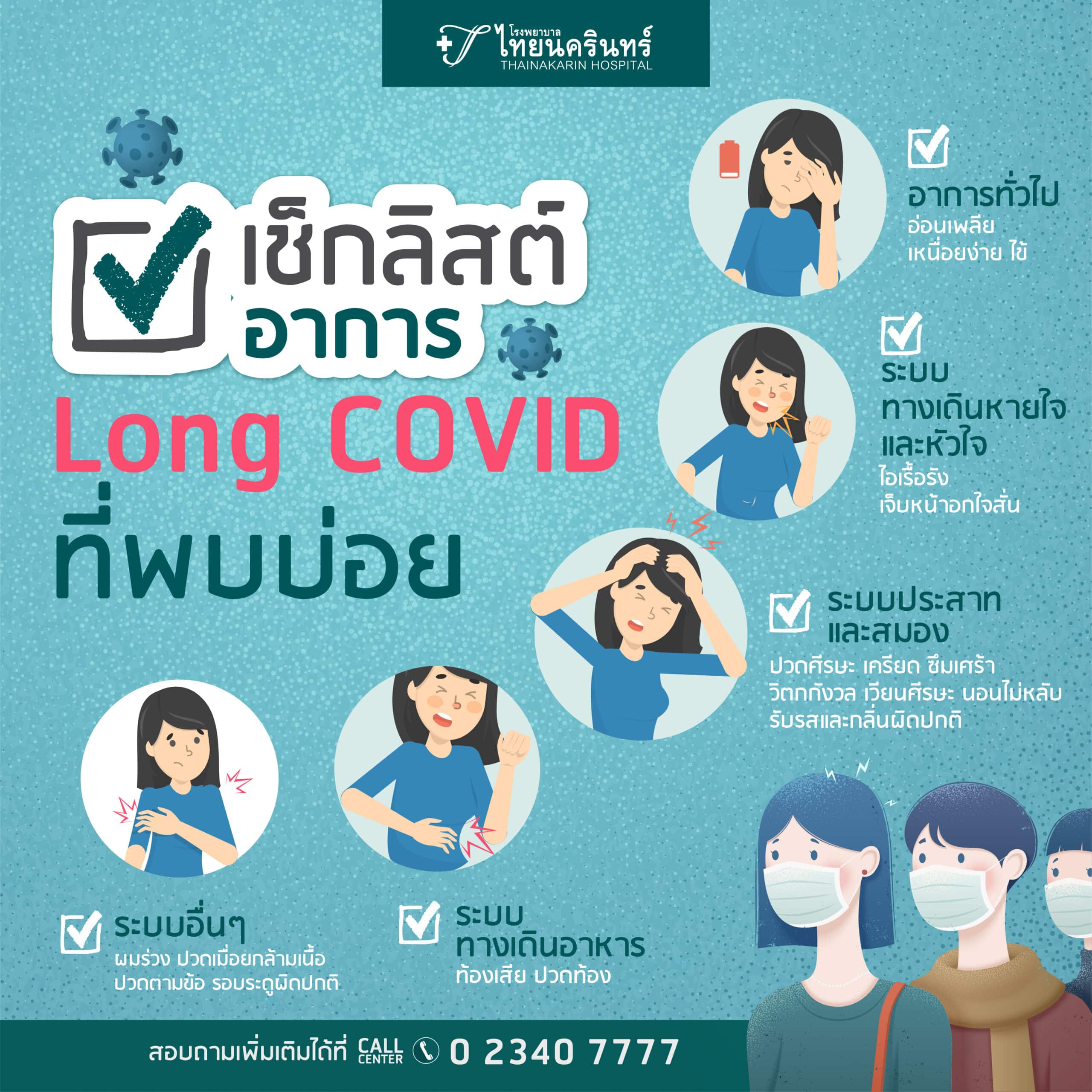 Long COVID คือ ภาวะที่ร่างกายยังคงมีอาการบางอย่างหลงเหลืออยู่แม้จะหายป่วยจากโรคโควิด-19 แล้ว โดยอาการมักจะเป็นยาวนานกว่า 4 สัปดาห์ ซึ่งอาการที่พบบ่อยที่สุด คือ อ่อนเพลีย เหนื่อยง่าย มีไข้ ไอเรื้อรัง เจ็บหน้าอก ใจสั่น ปวดศีรษะ เครียด มีภาวะซึมเศร้าหรือวิตกกังวล เวียนศีรษะ นอนไม่หลับ การรับรสและกลิ่นผิดปกติ ท้องเสีย ปวดท้อง ผมร่วง ปวดเมื่อยกล้ามเนื้อ ปวดตามข้อ และรอบระดูผิดปกติ ทำให้ผู้ที่หายป่วยโควิด-19 บางรายยังไม่สามารถกลับไปใช้ชีวิตประจำวันได้ดังเดิม