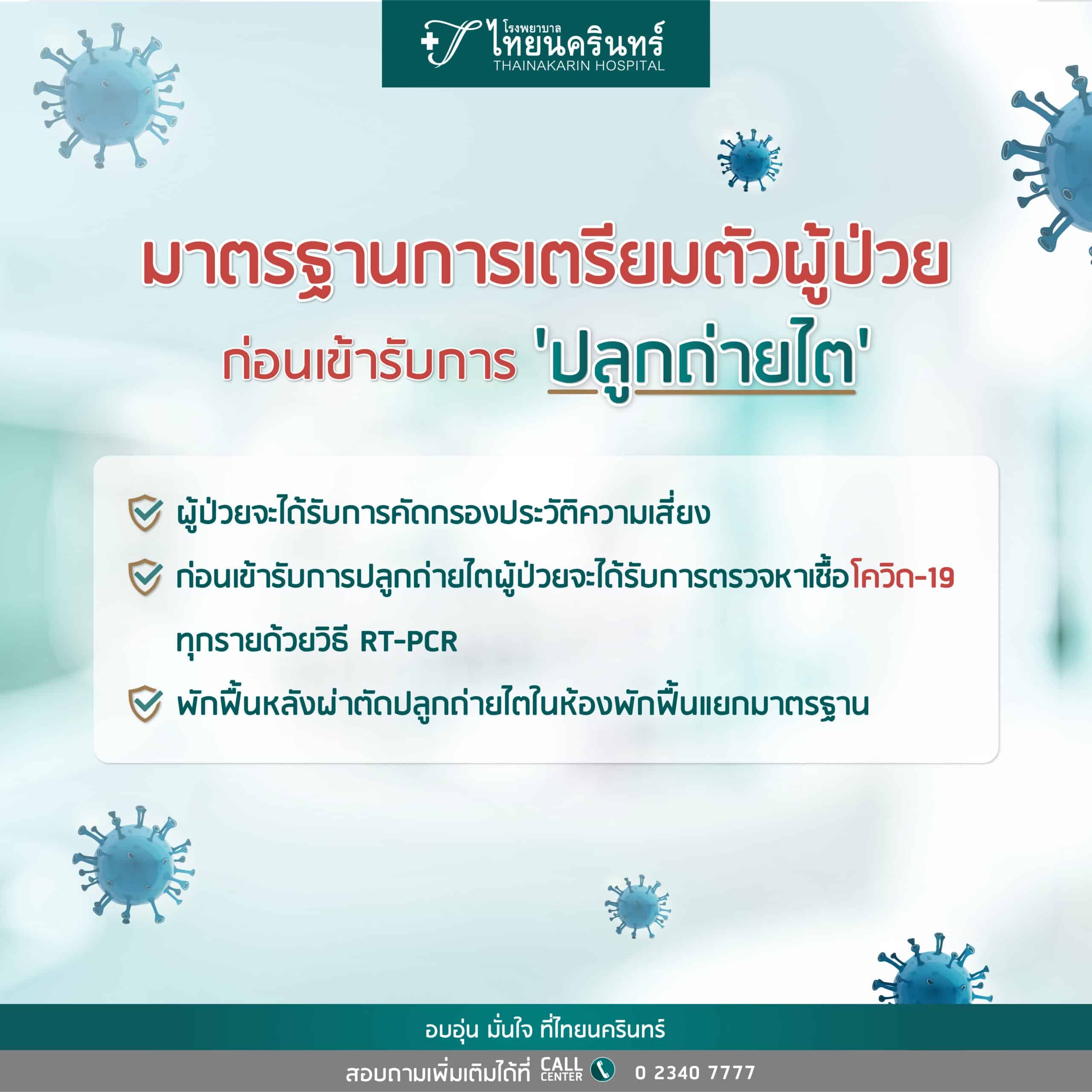 - ก่อนเข้ารับการปลูกถ่ายไตผู้ป่วยจะได้รับการตรวจหาเชื้อโควิด-19 ทุกราย ด้วยวิธี RT-PCR