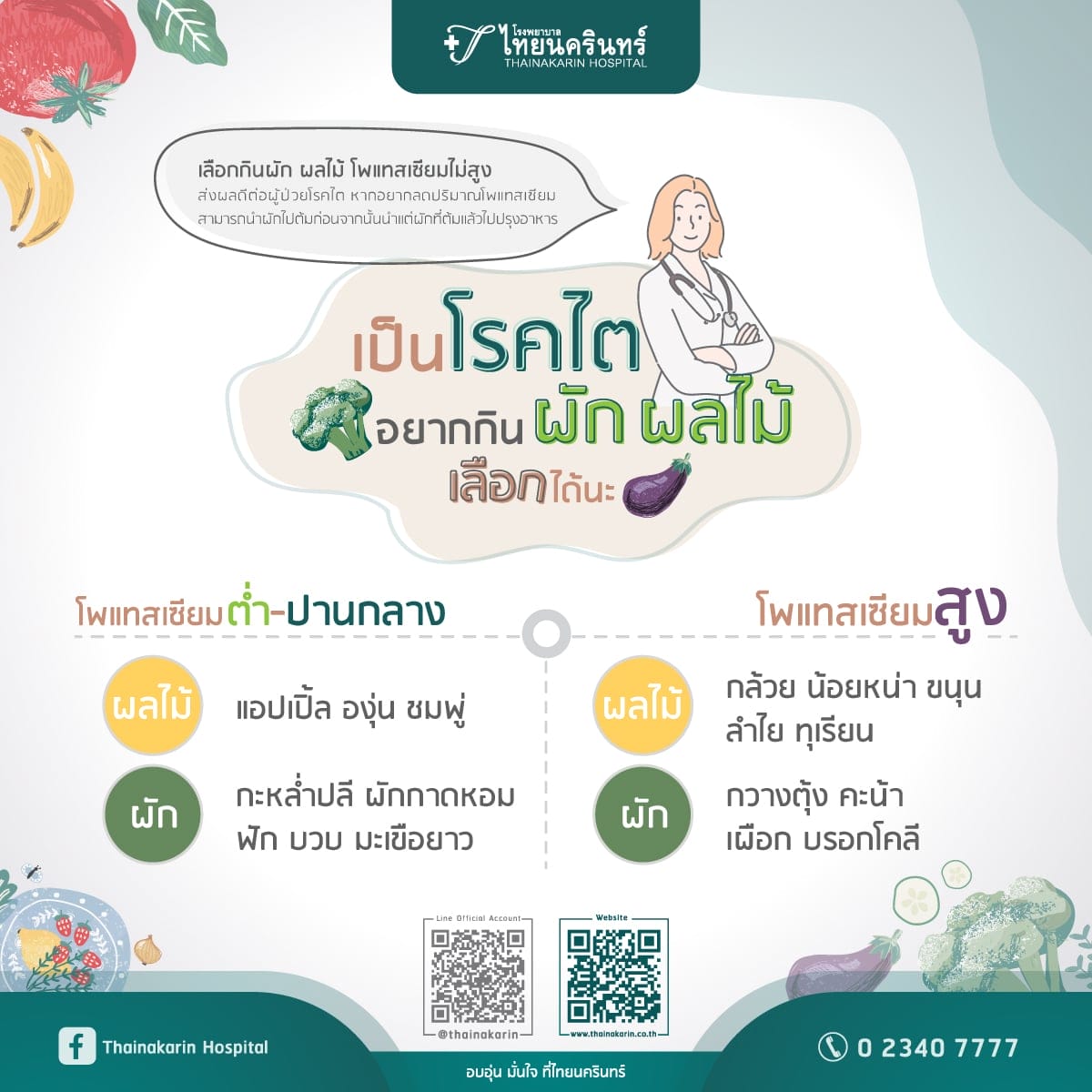 • เลือกกินผักที่มีโพแทสเซียมต่ำถึงปานกลาง เช่น กะหล่ำปลี, ผักกาดหอม, ฟัก, บวบ, มะเขือยาว เป็นต้น และหลีกเลี่ยงผักที่มีโพแทสเซียมสูง เช่น กวางตุ้ง, คะน้า, เผือก, บล็อคโคลี่ เป็นต้น